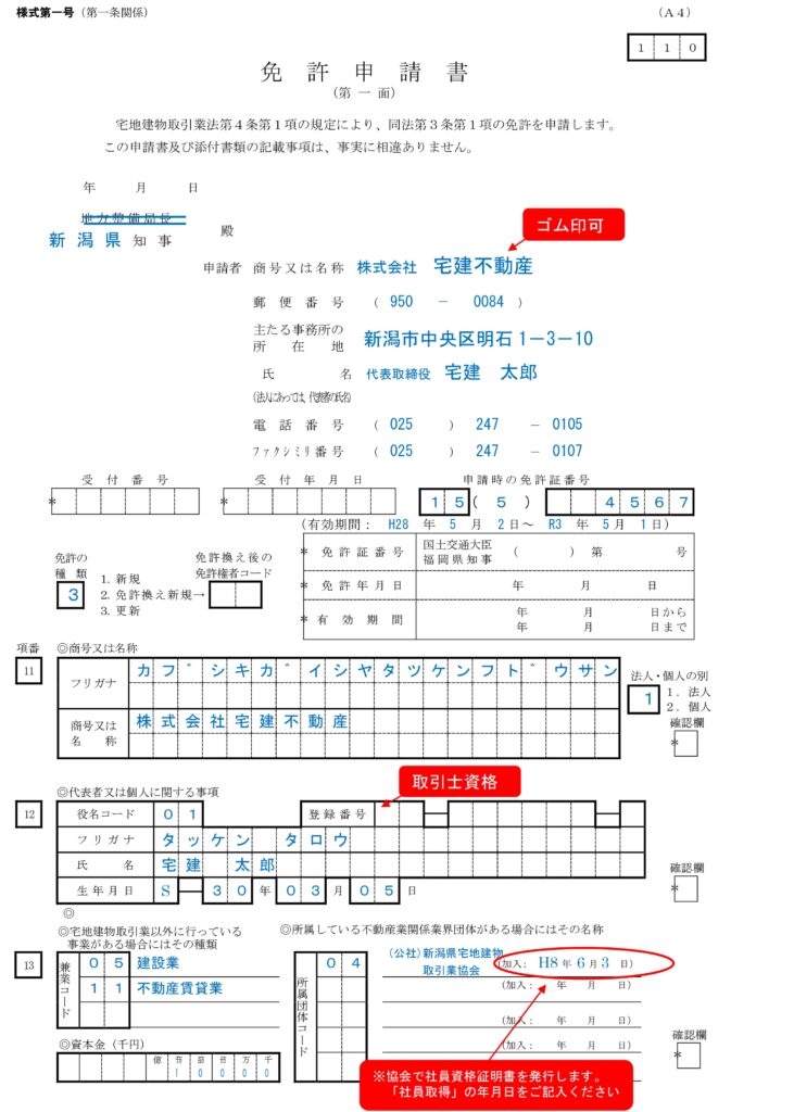 • 宅建業免許申請書:事業内容、事務所の概要、役員の情報などを詳細に記載します。
